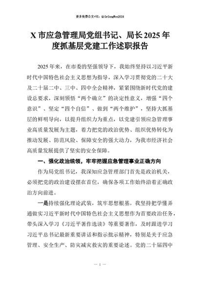 【七哥公文】2026年:X市应急管理局党组书记、局长2025年度抓基层党建工作述职报告+更多免费公文+VX:QiGeGongWen2024