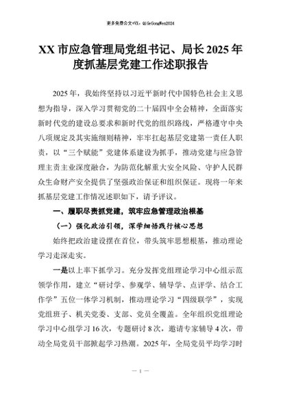 【七哥公文】2026年:XX市应急管理局党组书记、局长2025年度抓基层党建工作述职报告+更多免费公文+VX:QiGeGongWen2024