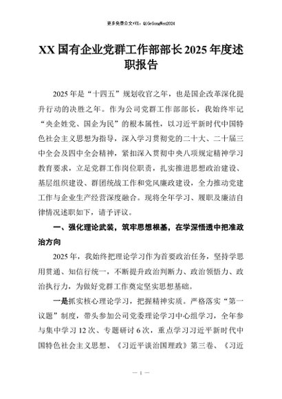 / 【七哥公文】2026年:XX国有企业党群工作部部长2025年度述职报告+更多免费公文+VX:QiGeGongWen2024
