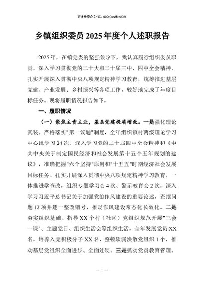 【七哥公文】2026年:乡镇组织委员2025年度个人述职报告+更多免费公文+VX:QiGeGongWen2024