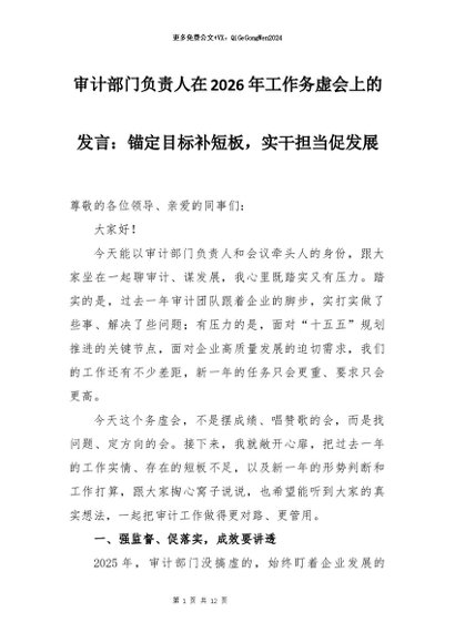 【七哥公文】2026年:审计部门负责人在2026年工作务虚会上的发言:锚定目标补短板,实干担当促发展+更多免费公文+VX:QiGeGongWen2024