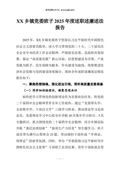 / 【七哥公文】2026年:XX乡镇党委班子2025年度述职述廉述法报告+更多免费公文+VX:QiGeGongWen2024