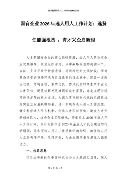 【七哥公文】2026年:国有企业2026年选人用人工作计划:选贤任能强根基 ,育才兴企启新+更多免费公文+VX:QiGeGongWen2024