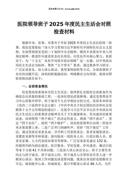 / 【七哥公文】2026年:医院领导班子2025年度民主生活会对照检查材料+更多免费公文+VX:QiGeGongWen2024