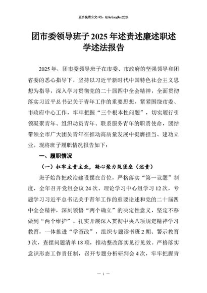 【七哥公文】2026年:团市委领导班子2025年述责述廉述职述学述法报告+更多免费公文+VX:QiGeGongWen2024