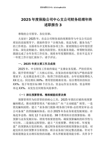 【七哥公文】2026年:2025年度保险公司中心支公司财务经理年终述职报告3+更多免费公文+VX:QiGeGongWen2024