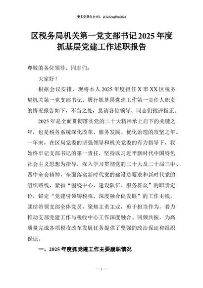 【七哥公文】2026年:区税务局机关第一党支部书记2025年度抓基层党建工作述职报告+更多免费公文+VX:QiGeGongWen2024