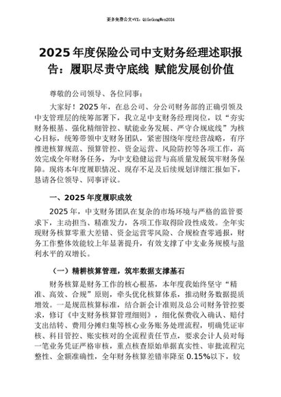 【七哥公文】2026年:2025年度保险公司中支财务经理述职报告:履职尽责守底线 赋能发展创价值+更多免费公文+VX:QiGeGongWen2024