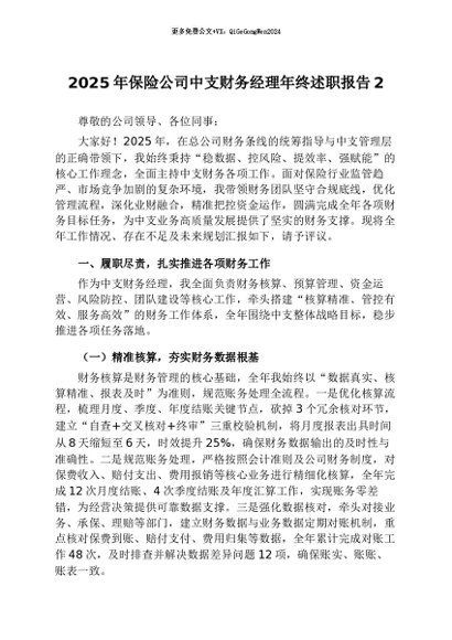 / 【七哥公文】2026年:2025年保险公司中支财务经理年终述职报告2+更多免费公文+VX:QiGeGongWen2024
