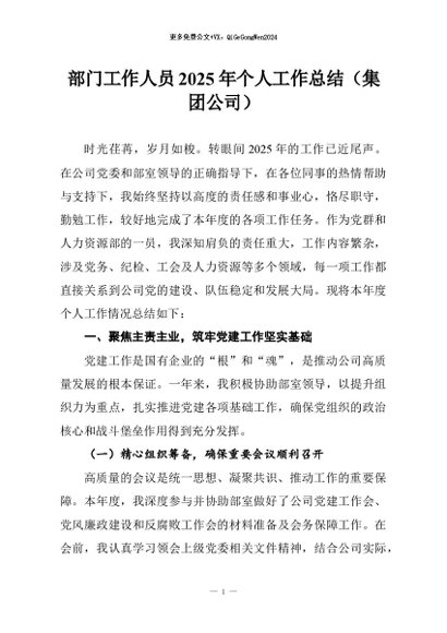 【七哥公文】2026年:部门工作人员2025年个人工作总结(集团公司)+更多免费公文+VX:QiGeGongWen2024
