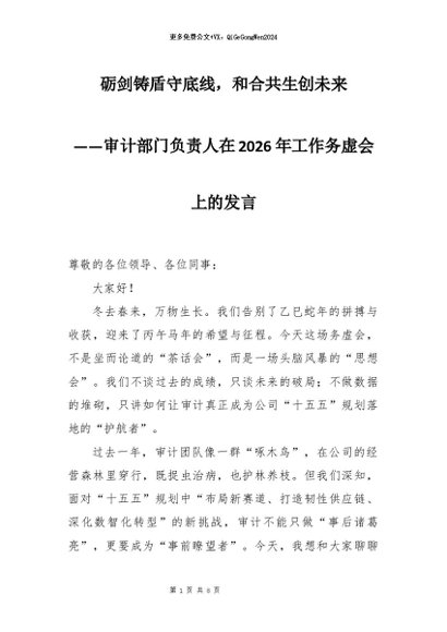 【七哥公文】2026年:审计部门负责人在2026年工作务虚会上的发言:砺剑铸盾守底线,和合共生创未来+更多免费公文+VX:QiGeGongWen2024