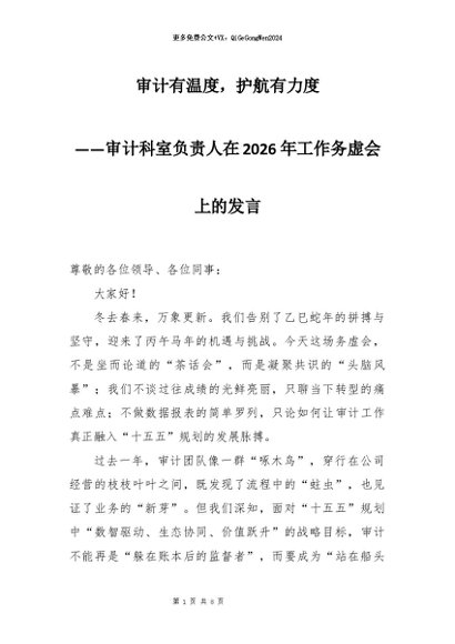 【七哥公文】2026年:审计科室负责人在2026年工作务虚会上的发言:审计有温度,护航有力度+更多免费公文+VX:QiGeGongWen2024