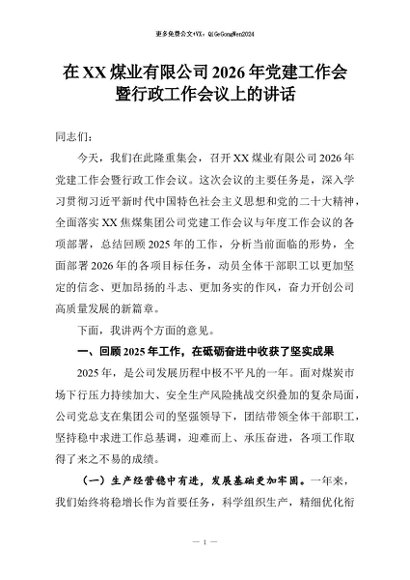 【七哥公文】2026年:在XX煤业有限公司2026年党建工作会暨行政工作会议上的讲话+更多免费公文+VX:QiGeGongWen2024