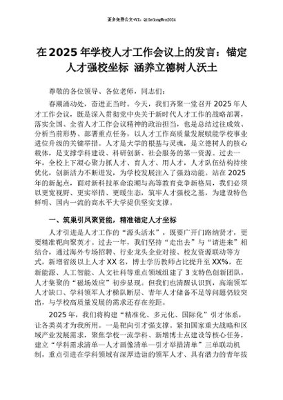 【七哥公文】2026年:在2025年学校人才工作会议上的发言:锚定人才强校坐标 涵养立德树人沃土+更多免费公文+VX:QiGeGongWen2024