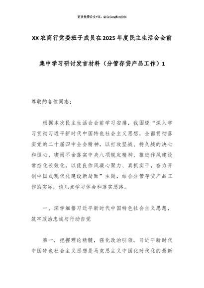 【七哥公文】2026年:XX农商行党委班子成员在2025年度民主生活会会前集中学习研讨发言材料(分管存贷产品工作)1_副本+更多免费公文+VX:QiGeGongWen2024
