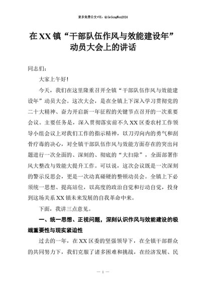 【七哥公文】2026年:在XX镇“干部队伍作风与效能建设年”动员大会上的讲话+更多免费公文+VX:QiGeGongWen2024