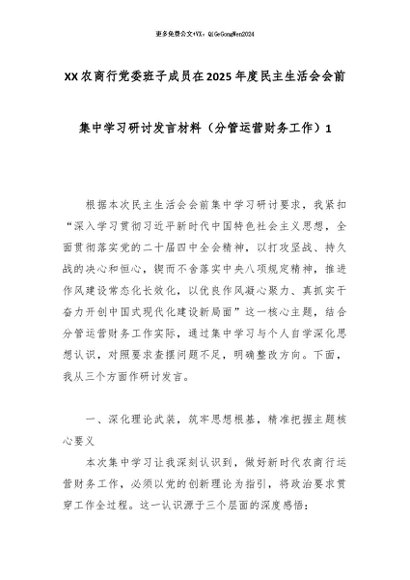 【七哥公文】2026年:XX农商行党委班子成员在2025年度民主生活会会前集中学习研讨发言材料(分管运营财务工作)1_副本+更多免费公文+VX:QiGeGongWen2024