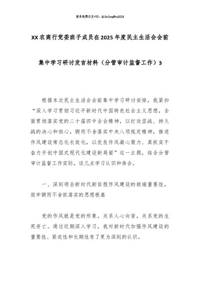 【七哥公文】2026年:XX农商行党委班子成员在2025年度民主生活会会前集中学习研讨发言材料(分管审计监督工作)3_副本+更多免费公文+VX:QiGeGongWen2024