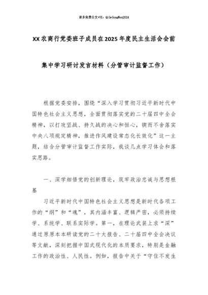 【七哥公文】2026年:XX农商行党委班子成员在2025年度民主生活会会前集中学习研讨发言材料(分管审计监督工作)1_副本+更多免费公文+VX:QiGeGongWen2024