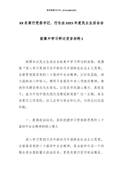 【七哥公文】2026年:XX农商行党委书记、行长在2025年度民主生活会会前集中学习研讨发言材料1_副本+更多免费公文+VX:QiGeGongWen2024