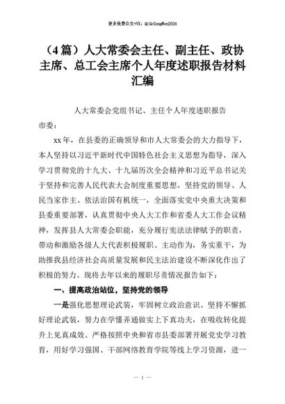【七哥公文】2026年:(4篇)人大常委会主任、副主任、政协主席、总工会主席个人年度述职报告材料汇编+更多免费公文+VX:QiGeGongWen2024