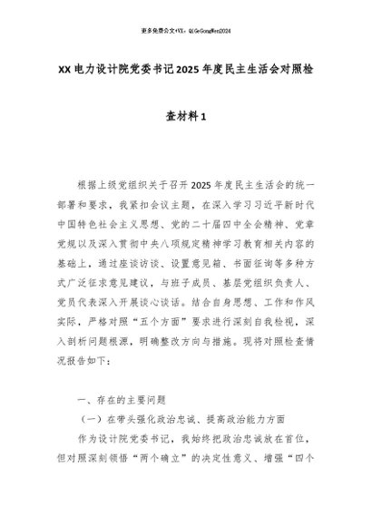 【七哥公文】2026年:XX电力设计院党委书记2025年度民主生活会对照检查材料_副本+更多免费公文+VX:QiGeGongWen2024