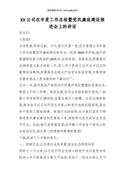 【七哥公文】2026年:XX公司在年度工作总结暨党风廉政建设推进会上的讲话_副本+更多免费公文+VX:QiGeGongWen2024