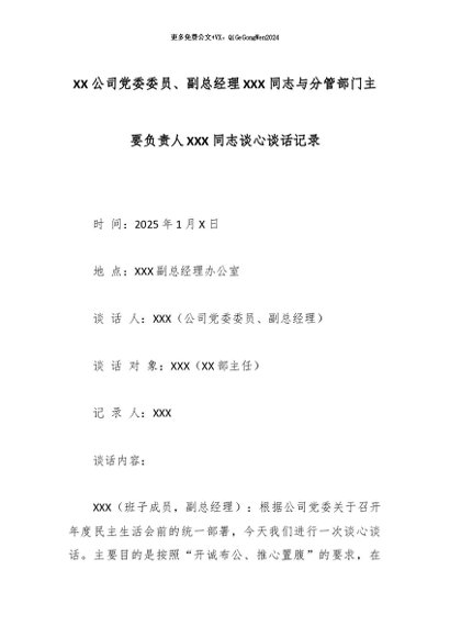 【七哥公文】2026年:XX公司党委委员、副总经理XXX同志与分管部门主要负责人XXX同志谈心谈话记录_副本+更多免费公文+VX:QiGeGongWen2024