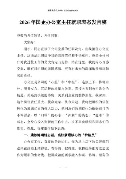 【七哥公文】2026年:2026年国企办公室主任就职表态发言稿+更多免费公文+VX:QiGeGongWen2024