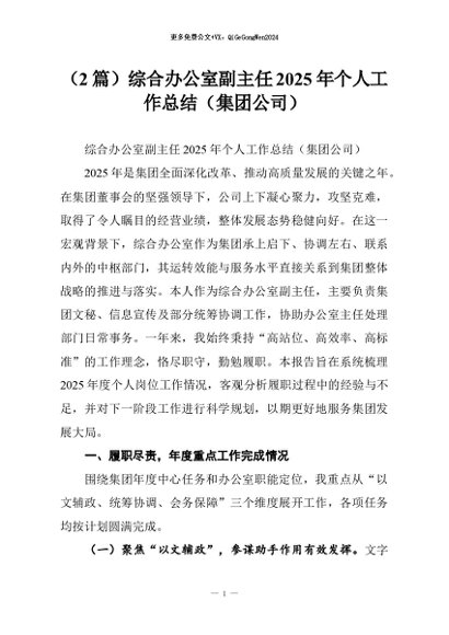 【七哥公文】2026年:(2篇)综合办公室副主任2025年个人工作总结(集团公司)+更多免费公文+VX:QiGeGongWen2024
