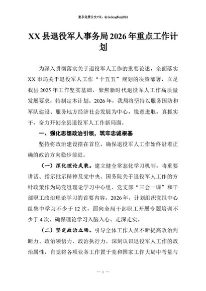 【七哥公文】2026年:XX县退役军人事务局2026年重点工作计划+更多免费公文+VX:QiGeGongWen2024