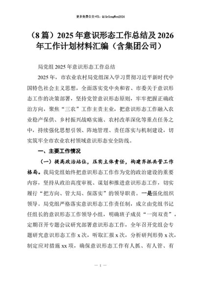 【七哥公文】2026年:(8篇)2025年意识形态工作总结及2026年工作计划材料汇编(含集团公司)+更多免费公文+VX:QiGeGongWen2024