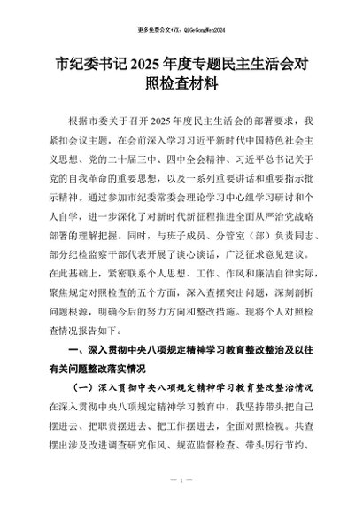 【七哥公文】2026年:市纪委书记2025年度专题民主生活会对照检查材料+更多免费公文+VX:QiGeGongWen2024