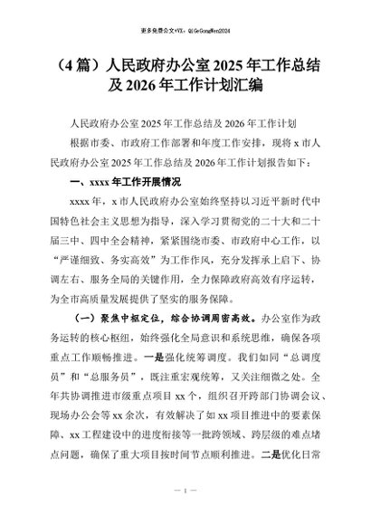 【七哥公文】2026年:(4篇)人民政府办公室2025年工作总结及2026年工作计划汇编+更多免费公文+VX:QiGeGongWen2024