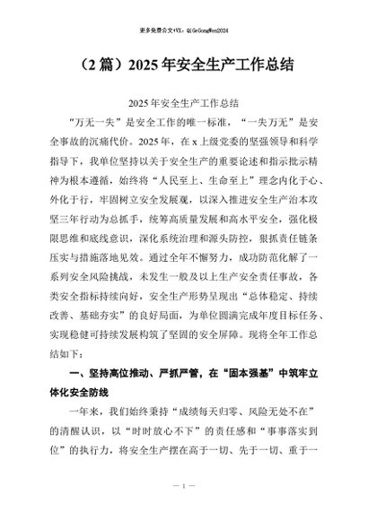 / 【七哥公文】2026年:(2篇)2025年安全生产工作总结+更多免费公文+VX:QiGeGongWen2024