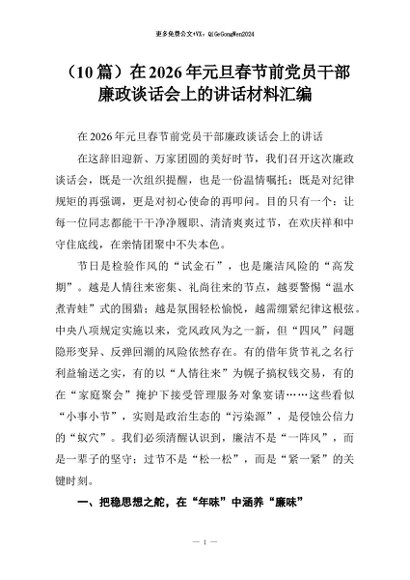【七哥公文】2026年:(10篇)在2026年元旦春节前党员干部廉政谈话会上的讲话材料汇编+更多免费公文+VX:QiGeGongWen2024