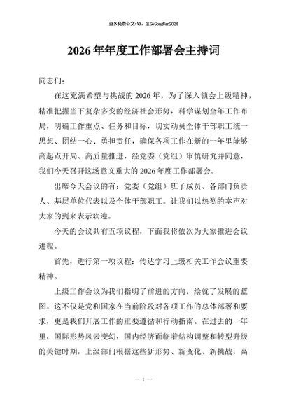 / 【七哥公文】2026年:2026年年度工作部署会主持词+更多免费公文+VX:QiGeGongWen2024