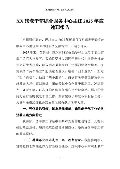 【七哥公文】2026年:XX旗老干部综合服务中心主任2025年度述职报告+更多免费公文+VX:QiGeGongWen2024