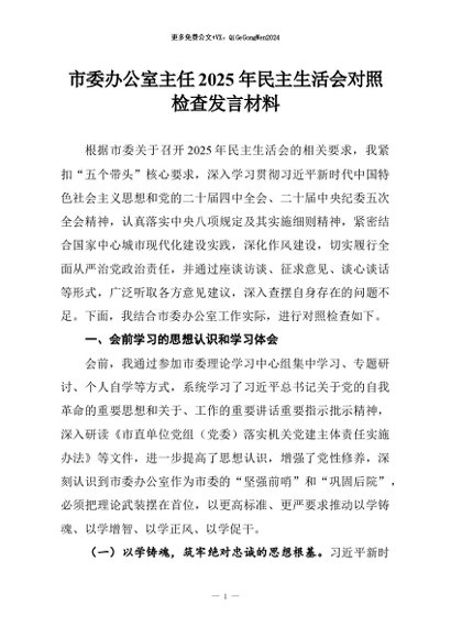 【七哥公文】2026年:市委办公室主任2025年民主生活会对照检查发言材料+更多免费公文+VX:QiGeGongWen2024