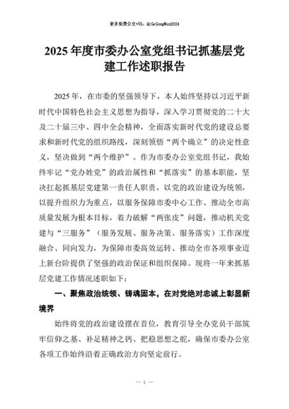 【七哥公文】2026年:2025年度市委办公室党组书记抓基层党建工作述职报告+更多免费公文+VX:QiGeGongWen2024