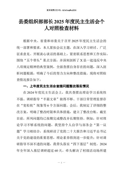 【七哥公文】2026年:县委组织部部长2025年度民主生活会个人对照检查材料+更多免费公文+VX:QiGeGongWen2024