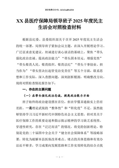 【七哥公文】2026年:XX县医疗保障局领导班子2025年度民主生活会对照检查材料+更多免费公文+VX:QiGeGongWen2024
