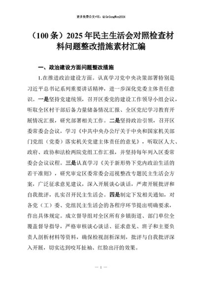 【七哥公文】2026年:(100条)2025年民主生活会对照检查材料问题整改措施素材汇编+更多免费公文+VX:QiGeGongWen2024