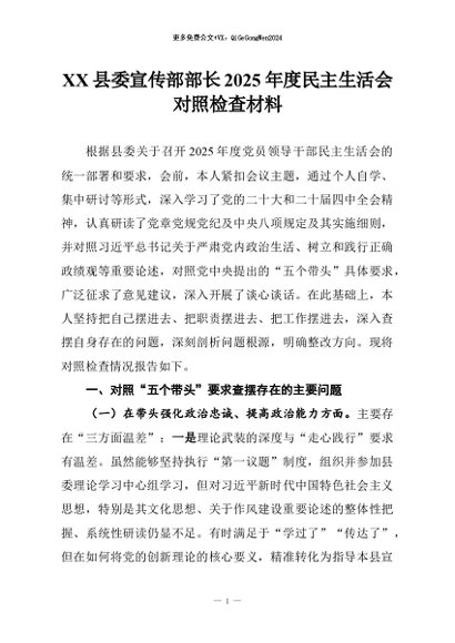 【七哥公文】2026年:XX县委宣传部部长2025年度民主生活会对照检查材料+更多免费公文+VX:QiGeGongWen2024