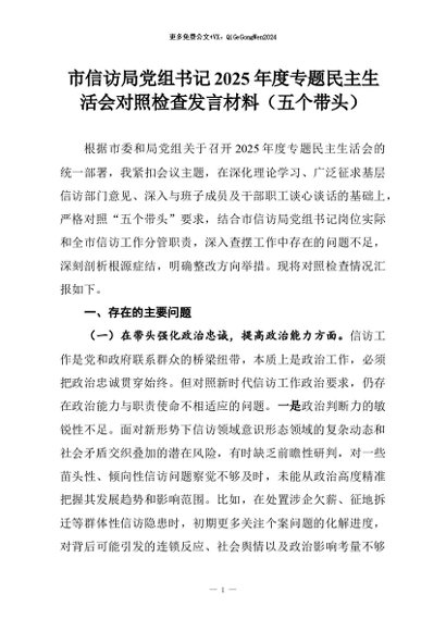 【七哥公文】2026年:市信访局党组书记2025年度专题民主生活会对照检查发言材料(五个带头)+更多免费公文+VX:QiGeGongWen2024