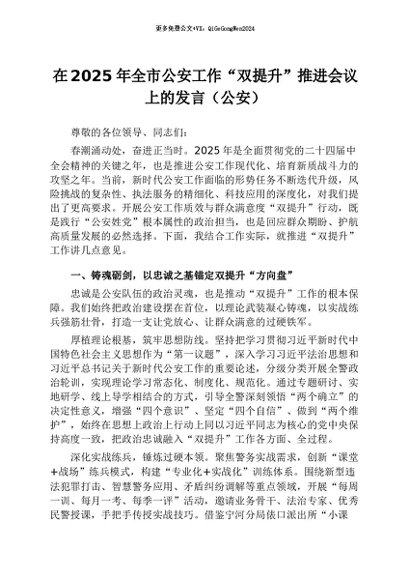 【七哥公文】2026年:在2025年全市公安工作“双提升”推进会议上的发言(公安)+更多免费公文+VX:QiGeGongWen2024