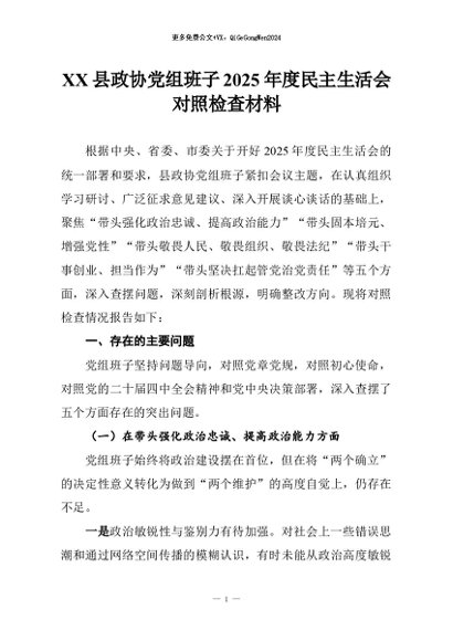 【七哥公文】2026年:XX县政协党组班子2025年度民主生活会对照检查材料+更多免费公文+VX:QiGeGongWen2024