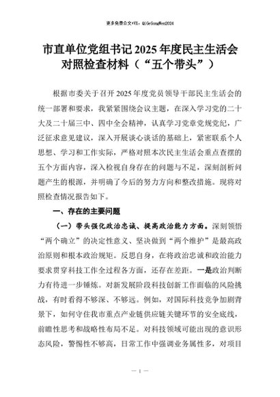 【七哥公文】2026年:市直单位党组书记2025年度民主生活会对照检查材料(“五个带头”)+更多免费公文+VX:QiGeGongWen2024