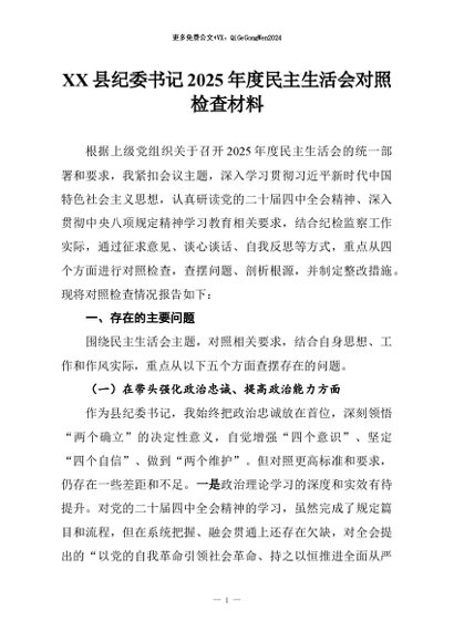 【七哥公文】2026年:XX县纪委书记2025年度民主生活会对照检查材料+更多免费公文+VX:QiGeGongWen2024
