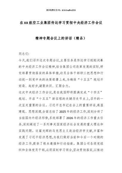 【七哥公文】2026年:在XX航空工业集团传达学习贯彻中央经济工作会议精神专题会议上的讲话(精品)_副本+更多免费公文+VX:QiGeGongWen2024